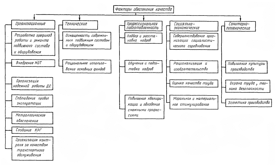 Рис. 4 Факторы обеспечения качества транспортного обслуживания на предприятиях городского электрического транспорта Организационные мероприятия включают в себя: разработку надежных графиков работы подвижного состава на линии и его ремонтов, обеспечивающих надежное, качественное и бесперебойное обслуживание населения; соблюдение правил эксплуатации путевого и электрохозяйств; своевременное и качественное материально-техническое снабжение; внедрение научной организации труда; надежную работу диспетчерской службы; организацию метрологического обеспечения; создание координационно-рабочей группы (КРГ); организацию контроля за качеством транспортного обслуживания. 5.3. Технические мероприятия должны обеспечить: оснащенность предприятий городского электрического транспорта современным подвижным составом и оборудованием; "полное и наиболее рациональное использование имеющихся основных фондов, внедрение средств Механизации и автоматизации. 5.4. Мероприятия по профессиональной подготовке включают: набор и расстановку кадров в соответствии с потребностью и квалификационными требованиями предприятия; обучение и подготовка кадров; повышение квалификации и овладение смежными профессиями и т.д. 5.5. К социально-экономическим мероприятиям относятся: совершенствование организации социалистического соревнования; рационализация и изобретательство; разработка положения о моральном и материальном стимулировании качества; выбор критериев, определяющих работу исполнителей. 5.6. Санитарно-гигиенические мероприятия сводятся к: обеспечению соответствующего высокопроизводительного психологического микроклимата; повышению культуры производства; охране труда и соблюдению требований техники безопасности; эстетике производства. 5.7. Функциями КС УКТО, обеспечивающими высокое качество транспортного обслуживания, являются: обеспечение всех структурных подразделений предприятия нормативно-технической документацией; метрологическое обеспечение предприятия; разработка и внедрение стандартов; внедрение мероприятий по обеспечению надежного и бесперебойного транспортного обслуживания населения. 5.8. За обеспеченность предприятия нормативно-технической документацией и за разработку и внедрение стандартов отвечает руководитель предприятия. 5.9. Высокое качество транспортного обслуживания достигается при осуществлении комплекса мероприятий, направленных на организацию работы каждого подразделения предприятия строго в соответствии с государственными и отраслевыми стандартами и стандартами предприятия. 5.10. В прил. 7 приведены типовые стандарты предприятия городского электрического транспорта, которые могут быть положены в основу при разработке конкретных СТП. При необходимости предприятие может включать в типовые СТП дополнительные показатели, вносить уточнения и изменения, отражающие специфику соответствующего предприятия. 6. КОНТРОЛЬ КАЧЕСТВА6.1. Основными задачами контроля являются: установление соответствия качества транспортного обслуживания требованиям стандартов и другой нормативно-технической документации; установление качества ремонтных работ; изучение обоснованных жалоб пассажиров; организация учета, анализа и информации о качестве. 6.2. Контроль осуществляется по качеству транспортного обсл