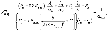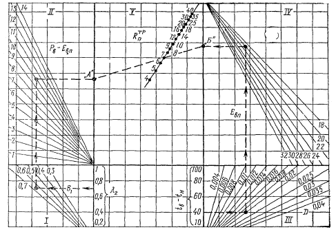 Для облегчения расчета составлена номограмма (см. далее). Погрешность при пользовании номограммой не превышает 10 %. Номограмма состоит из пяти полей, пронумерованных римскими цифрами I-V. На правой вертикальной шкале поля I даны значения l2, на наклонных отрезках - d1 Наклонные отрезки второго поля соответствуют значениям Левая вертикаль поля III представляет собой шкалу разности температур tв-tн. Правее ее изображены наклонные отрезки с величинами µ. На наклонных отрезках поля IV приведены значения 0,8 Ев.п. На поле V находится одна наклонная шкала со значениями