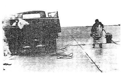 4.4. Эффективность обработки покрытий достигается при нанесении пропитывающих составов на сухой и чистый бетон. Поэтому подготовке покрытий уделяется особое внимание. Перед началом работ производится тщательная очистка поверхности покрытий от пыли и грязи механическими щетками машины ПМ-130 и газовоздушной струей от авиадвигателя ветровой машины. Сильно загрязненные участки покрытий следует промыть водяной струей машины ПМ-130 и затем просушить ветровой машиной, работающей на режиме малого газа и при скорости, обеспечивающей полное высыхание бетонного покрытия. 4.5. Для нанесения