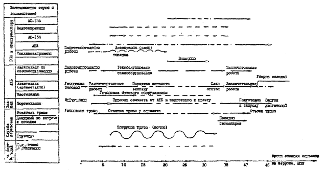 Примечание. Перронные автобусы применяются только в аэропортах I и II категорий при удалении места стоянки самолета на перроне от аэровокзала более 70 м. 3.16. Обслуживание самолетов на перроне производится в соответствии с графиком оперативного технического обслуживания (рис. 1) в зависимости от типа самолета. 3.17. Принципиальные схемы обслуживания пассажиров с багажом, обработки грузов и почты в зависимости от метода обслуживания с указанием средств механизации по каждой операции приведены на рис. 2-6. В случае отсутствия в аэропорту указанных средств механизации необходимо использовать средства, аналогичной производительности или грузоподъемности в соответствии с табелем средств механизации. 3.18. Принципиальные схемы технологических процессов обслуживания вахтовых перевозок пассажиров и грузов ПАНХ в вертолетных подразделениях аэропортов МВЛ и технологических процессов вертолетного подразделения ПАНХ приведены на рис. 7. 4. СОСТАВ ЗДАНИЙ И СООРУЖЕНИЙ В АЭРОПОРТАХ МВЛ И ИХ РАСПОЛОЖЕНИЕ НА ГЕНЕРАЛЬНОМ ПЛАНЕ4.1. Требования к проектированию генеральных планов аэропортов МВЛ аналогичны требованиям к проектированию классифицированных аэропортов и приведены в ВНТП I. При планировке служебно-технической территории (СТТ) необходимо соблюдать требования главы СНиП "Генеральные планы промышленных предприятий". 4.2. Мощность зданий и сооружений определяется расчетом на основе исходных данных по настоящему Руководству и действующим ведомственным нормам проектирования. Ориентировочный состав зданий и сооружений приведен в приложении 1. Объемы и площади зданий и сооружений рассчитаны для минимального и максимального объемов перевозок аэропортов МВЛ каждой категории. Рис. 1. Исходный технологический график подготовка Ан-24 к начальному рейсу