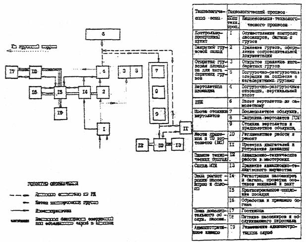 Рис. 6. Принципиальная схема обработки грузов, прибывших из города Рис. 7. Схема технологических процессов обслуживания вахтовых пассажиров и грузов ПАНХ в вертолетном подразделении аэропорта МВЛ Ориентировочная стоимость строительства зданий и сооружений аэропортов МВЛ по категориям приведена в приложении 2. 4.3. Грузовые самолеты в аэропортах МВЛ, как правило, следует размещать на пассажирском перроне. При значительном объеме грузовых авиаперевозок может предусматриваться специальный грузовой перрон для кратковременной стоянки грузовых самолетов при выполнении погрузочно-разгрузочных работ с одновременным техническим обслуживанием самолетов. Грузовой перрон должен, как правило, непосредственно примыкать к пассажирскому перрону или местам стоянки самолетов. Для обеспечения грузовых перевозок на аэродромах, где эксплуатируются вертолеты, могут предусматриваться площадки для хранения и подвески крупногабаритных грузов. 4.4. Привокзальная площадь предназначена для маневрирования и размещения средств общественного и индивидуального транспорта, прибывающего в аэропорт из города. 4.5. В аэропортах МВЛ I и II категорий грузовой склад и отдаление перевозки почты (ОПП), как правило, следует блокировать в одно здание, а в аэропортах МВЛ III категории со служебно-пассажирским зданием (СПЗ) или аэровокзалом. 4.6. К зданию грузового склада и ОПП должен примыкать со стороны города грузовой двор, предназначенный для стоянки и маневрирования автомашин, производящих погрузочно-разгрузочные операции. 4.7. Автодороги к грузовому складу и ОПП не должны пересекать привокзальную площадь. 4.8. Территория аэродромов, включая зоны рабочих секторов курсовых и глиссадных радиомаяков, должна иметь ограждения по всему периметру. Участки ограждения должны быть прямолинейными в плане с минимально необходимым количеством углов поворота. Тип ограждения следует принимать - колючую проволоку на железобетонных столбах или металлическую сетку высотой 2 м, с Т-образной насадкой высотой 0,1 м и с козырьком шириной по 0,5 м в каждую сторону из колючей проволоки, натянутой через 10 см. Участки территории зданий и сооружений с открытым хранением материалов, грузов, оборудования и механизмов, базу аэродромной службы, службу спецтранспорта, материальные склады следует ограждать, как правило, забором из металлической сетки высотой 2 м. Водопроводные и очистные сооружения, мазутное хозяйство котельных должны ограждаться согласно требованиям соответствующих СНиП. Примечание. Допускается предусматривать ограждение из местных материалов (ракушечник, туф, шлакобетон и др.). 4.9. Для обеспечения транспортной связи функциональных зон и отдельных объектов служебно-технической территории (CТT) между собой, аэродромом и подъездной автомобильной дорогой аэропорта следует предусматривать внутрипортовые основные и вспомогательные дороги. 4.10. Внутрипортовые дороги аэропортов следует проектировать как производственные дороги промышленных предприятий в соответствии с требованиями СНиП "Автомобильные дороги. Нормы проектирования". 4.11. При проектировании внутрипортовых автомобильных дорог необходимо предусматривать петлевые объезды или разворотные площадки, размер которых определяется расчетом, но не менее 12×12 м. 4.12. Габариты приближения края проезжей части вну