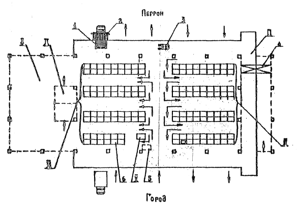 Рис. 8. Схема грузовых потоков, размещения оборудования, средств механизации и складских помещений в грузовых комплексах с суточным грузооборотом до 70 т: 1 - роликовые дорожки; 2 - автомашина с подъемным кузовом и роликовыми дорожками; 3 - аккумуляторный погрузчик; 4 - кран-балка; 5 - весы рычажные; 6 - стеллаж; I - административно-служебные помещения; II - холодильные камеры; III - навес для открытого хранения грузов; IV - зона хранения отправляемых грузов; V - рабочее место приемосдатчиков; VI - зона хранения прибывших грузов. Таблица 23
