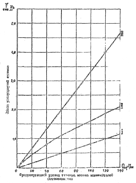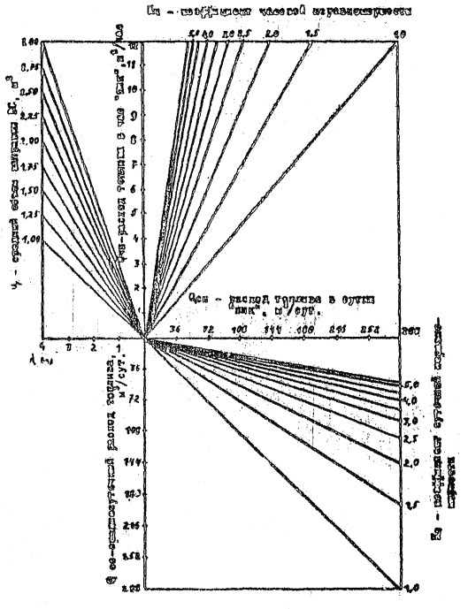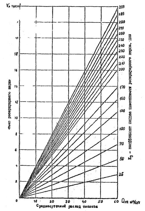 Примечание. Количество и назначение пультов уточняются в зависимости от класса аэродрома, структуры и количества диспетчерских пунктов службы движения, определяемых заданием на проектирование. 8.6. Для диспетчеров ДПСП, КДП MBЛ (СДП) должна предусматриваться световая и звуковая сигнализация состояния радиотехнических средств. 9. ОБЪЕКТЫ И СРЕДСТВА АВИАТОПЛИВООБЕСПЕЧЕНИЯ9.1. Склады ГСМ в зонах теплого и умеренного климата проектируются в соответствии с требованиями СНиП "Склады нефти и нефтепродуктов. Нормы проектирования" и "Ведомственных норм технологического проектирования объектов авиатопливообеспечения аэропортов" (ВНТП 6). 9.2. Склады ГСМ, расположенные в районах Крайнего Севера, проектируются в соответствии с нормативными документами, а также "Руководством по проектированию и эксплуатации складов топлива аэропортов Крайнего Севера". 9.3. Заправка топливом воздушных судов в зависимости от конкретных условий осуществляется топливозаправщиками, упрощенными системами централизованной заправки (ЦЗС) или переносными и передвижными средствами заправки. Технологические схемы заправки воздушных судов через систему ЦЗС, заправочного агрегата и пункта налива представлены в приложениях 8, 9 и 10. 9.4. Количество и типы средств заправки, фильтров, насосов, счетчиков и другого технологического оборудования выбираются при проектировании комплекса объектов ГСМ в зависимости от расходов топлива аэропортом, интенсивности движения и типов воздушных судов, а также способа доставки авиатоплива. Перечень рекомендуемого оборудования для объектов ГСМ представлен в приложении 11. 9.5. Объем потребной вместимости резервуарного парка определяется в следующем порядке: по каждому типу воздушных судов по номограммам (рис. 9, 10, 11), определяются расчетные расходы топлива (среднесуточный и в сутки "пик") в зависимости от интенсивности движения воздушных судов в час "пик" λ, среднего объема заправки q, коэффициента часовой неравномерности движения воздушных судов Кч и коэффициента суточной неравномерности движения воздушных судов Кс; определяются расчетные значения расходов топлива в аэропорту (среднесуточный и в сутки "пик") как сумма расходов топлива по каждому типу воздушных судов; по графикам (рис. 12, 13) определяется потребный объем резервуарного парка для различных способов доставки в зависимости от расчетных значений топлива в аэропорту. Рис. 9. Номограмма определения среднесуточного расхода топлива Qсс и расхода топлива в сутки "пик" Qсп в зависимости от интенсивности движения воздушных судов в час "пик" λ и среднего объема заправки q (для q = 0,1-1,0 м3) Рис. 10. Номограмма определения среднесуточного расхода топлива Qcc и расхода топлива в сутки "пик" Qсп в зависимости от интенсивности движения воздушных судов в час "пик" λ и среднего объема заправки q (для q = 1-3 м3) Рис. 11. Номограмма определения среднесуточного расхода топлива Qcc и расхода топлива в сутки "пик" Qсп в зависимости от интенсивности движения воздушных судов в час "пик" λ и среднего объема заправки q (для q = 1-10 м3) Рис. 12. График определения объема резервуарного парка при доставке топлива в аэропорт водным транспортом Рис. 13. График определения объема резервуарного парка при доставке автомобильным (I), железнодорожным (II) и трубопроводным (III) транспортом. 10. ЭЛЕКТРОСВЯЗЬ10.1. Электросвязь гражд