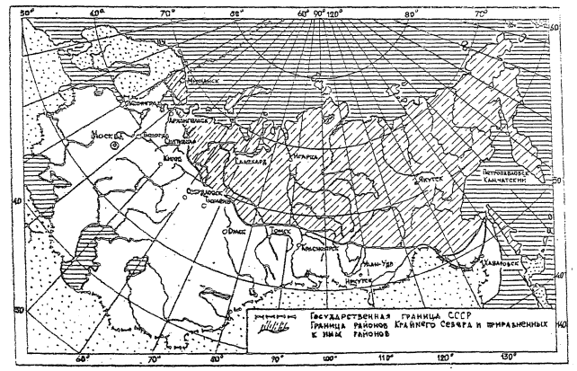 х) В варианте размещения помещения профилактического отдыха СПЗ данные кабинеты исключаются при совмещении здравпунктов. хх) Для обслуживания сотрудников аэропорта. 13. ОСОБЕННОСТИ ПРОЕКТИРОВАНИЯ АЭРОПОРТОВ МВЛ КРАЙНЕГО СЕВЕРА13.1. Выбор участка для аэропортов13.1.1. Положения настоящего раздала распространяются на аэропорты МВЛ, расположенные в районах Крайнего Севера и в приравненных к ним районах в соответствии с перечтем, утвержденным постановлением Совета Министров СССР от 10 ноября 1967 г, № 1029 (рис. 14). 13.1.2. Выбранный участок для аэропорта должен удовлетворять следующим инженерно-геологическим и топографическим условиям: участок должен иметь наиболее благоприятные в инженерном отношении геологические и мерзлотные характеристики, не иметь ископаемых льдов большой мощности, высокой льдистости грунтов у поверхности и активных проявлений мерзлотных процессов (образования бугров пучения, морозобойных трещин, просадок и т.д.); аэропорт должен размещаться на возвышенной местности, хорошо продуваемой зимними ветрами (во избежание отложения снега при метелях); рельеф прилегающей к аэропорту территории должен удовлетворять требованиям к приаэродромной территории и полосам воздушных подходов; рельеф участка должен исключать необходимость выемок, так как на вечномерзлых грунтах они недопустимы; желательно, чтобы естественный рельеф участка и прилегающей к нему территории обеспечивал благоприятные условия для организации поверхностного стока воды с аэродрома, так как применение подземных водоводов и коллекторов в системе водоотвода в зонах вечной мерзлоты не допускается; за пределами аэродрома желательно иметь водоприемник для сточных вод с перепадом высот, позволяющим организовать поверхностный сток с аэродрома и СТТ самотеком, без перекачки. 13.2. Особенности проектирования аэродромов13.2.1. Исправление естественного рельефа на аэродромах, размещаемых в зоне вечной мерзлоты, в целях сохранения мерзлотного режима грунта осуществляется насыпью, не нарушая при этом естественного мохоторфяного покрова. Рис. 14. Схематическая карта районов Крайнего Севера и приравненных к ним районов. 13.2.2. Для пропуска воды под покрытиями могут быть приняты безнапорные водоводы в виде труб диаметром не менее 1,0 м или каналов прямоугольного сечения. Размеры каналов подбираются так, чтобы было удобно их прочищать от возможного скопления льда. Расчетное заполнение сечения следует принимать равным (0,5-0,7) высоты. 13.2.3. Искусственные покрытия ВПП, РД, МС, перронов, приангарных и преддоковых площадок, а также дорог проектируются в насыпи с целью сохранения мерзлотного режима естественных грунтов. Величина насыпи определяется теплотехническим расчетом согласно указаниям соответствующего раздела СНиП "Аэродромы"/ 13.2.4. На аэродромах, проектируемых с устройством теплоизолирующих насыпей, сопряжение полос безопасности, обочин РД, МС и площадок специального назначения с окружающей местностью следует выполнять откосами с заложением 1:2-1:5 с их обязательной изоляцией. 13.2.5. От подножья откосов по всему периметру аэродрома предусматривается охранная зона шириной 25-50 м с целью сохранения в естественном состоянии мохорастительного покрова. Граница и ограждение аэродрома принимаются по внешнему контуру охранной зоны. 13.2.6. На аэродромах Крайнего 
