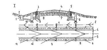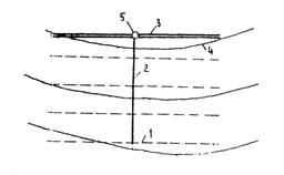 Рис. 2. Схема поверхностного дренажа грунтового участка аэродрома: 1 - осушитель; 2 - собиратель; 3 - коллектор; 4 - горизонталь; 5 - смотровой колодец 2.6. Для понижения уровня грунтовых вод должно предусматриваться устройство глубинного дренажа (рис. 3). Дрены при этом необходимо располагать параллельно гидроизогипсам. Заглубление дрен и расстояния между ними определяются расчетом. 2.7. Водоотводные и дренажные системы аэродромных покрытий должны проектироваться в соответствии с пп. 6.1 - 6.30 главы СНиП "Аэродромы". Нормы проектирования".