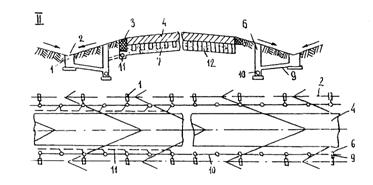 Рис. 4. Схемы водоотводных и дренажных систем (профиль и план) аэродромных покрытий: 1 - тальвежный колодец; 2 - грунтовый лоток; 3 - отмостка; 4 - покрытие; 5 - лоток в кромке покрытия; 6 - смотровой колодец; 7 - основание с дренирующим слоем; 8 - дождеприемный колодец; 9 - перепуск; 10 - коллектор; 11 - закромочная дрена; 12 - основание без дренирующего слоя