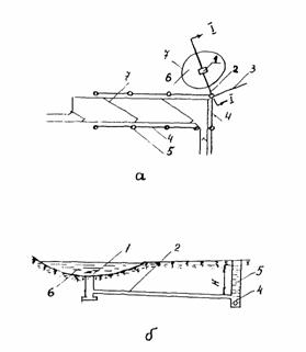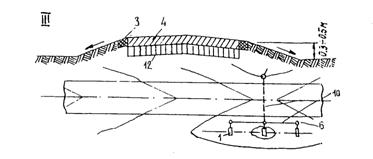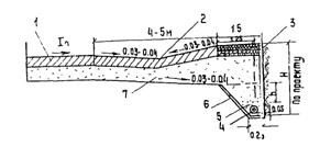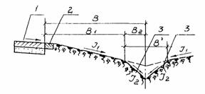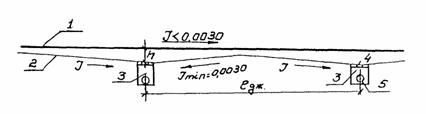 Рис. 5. Схема устройства регулирующего бассейна на аэродроме; а - план; б - разрез по I - I; 1 - тальвежный колодец; 2 - перепуск; 3 - главный коллектор; 4 - коллектор; 5 - смотровой колодец; 6 - регулирующий бассейн; 7 - горизонталь Наполнение и опорожнение бассейна осуществляется через перепускную трубу 2 (см. рис, 5), имеющую уклон в сторону коллекторов. Наполнение бассейна происходит при напорном режиме работы коллектора 3. Целесообразность устройства регулирующих бассейнов должно быть обосновано технико-экономическими расчетами. 2.10. Водостоки с участков искусственных покрытий, сточные воды с которых могут иметь недопустимую концентрацию загрязнений (площадки мойки и т.п.), могут проектироваться в виде самостоятельной водоотводной линии с подачей сточной воды в соответствующие очистные сооружения (см. раздел 7). 2.11. При ширине склона В равной 25 м, и уклоне склона J1, равном 0,015 - 0,025 рекомендуется принимать ширину лотка В' равной 10 м и уклон сторон лотка J2 равным 0,05 - 0,08. При ширине склона, равной 10 - 15 м, и уклоне склона 0,015 - 0,030 рекомендуется принимать ширину лотка равной 5 м и уклон сторон лотка, равный 0,10 - 0,15. 3. КОНСТРУКЦИЯ ЭЛЕМЕНТОВ ВОДООТВОДНЫХ И ДРЕНАЖНЫХ СИСТЕМ3.1. Открытые лотки в кромках покрытий (схема 1 на рис. 4) проектируются треугольного сечения вдоль низовых кромок покрытия. На покрытиях двускатного профиля лотки предусматриваются с двух сторон. Лотковый ряд плит входит в рабочую ширину покрытий. Для ВПП с односкатным профилем, групповых МС, перронов и спецплощадок с искусственным покрытием, ширина склона которых составляет более 30 м, лотки должны проектироваться шириной 5 м и глубиной 10 см. Для ВПП двускатного профиля и участков искусственных покрытий РД, имеющих ширину склона 30 м и менее, лотки в кромках покрытия устраиваются только в исключительных случаях, при надлежащем обосновании. Ширина лотка должна быть 4 м, глубина 8 см. В остальных случаях поверхностная вода должна сбрасываться на грунтовую обочину. При необходимости, размеры лотков уточняются путем гидравлического расчёта. Продольные уклоны лотков с искусственным покрытием должны быть не менее 0,0030. В случае меньших уклонов покрытия лоткам придается пилообразный профиль с минимально допустимыми продольными уклонами 0,0030 (рис. 6).