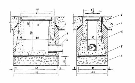 Рис. 8. Дождеприемный колодец с решеткой из одного звена: 1 - просмоленная пенька; 2 - перепуск; 3 - битумная мастика; 4 - песочно-битумный коврик; 5 - водоустойчивый грунт; 6 - цементный раствор; 7 - шлаковая подушка; 8 - опорная рама