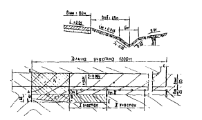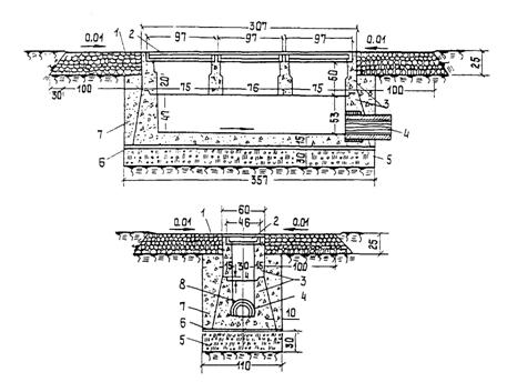Рис. 6. Лоток пилообразного профиля (продольный разрез): 1 - поверхность аэродромного покрытия; 2 - дно лотка; 3 - дождеприемное устройство; 4 - металлическая решетка; 5 - перепускная труба 3.2. Закрытые лотки, в том числе и пилообразного профиля, проектируются вместо открытых лотков в случаях, когда расстояния между дождеприемными колодцами открытых лотков оказываются по гидравлическому расчету менее 40 м. Закрытый лоток имеет коробчатое поперечное сечение и продольный уклон дна не менее 0,005. При пилообразном продольном профиле начальное заглубление лотка принимается 15 см. По длине лотка устраиваются температурно-усадочные швы через 30 - 50 м. По всей длине лотка в месте соприкосновения его с искусственным покрытием устраивается шов шириной 2 см, который заполняется мастикой. 3.3. Открытые лотки в отмостке покрытий должны быть тех же размеров, что и открытые лотки в кромках покрытий. 3.4. Грунтовые лотки, с помощью которых осуществляется перехват и отвод в дождеприемные устройства поверхностной воды с аэродромных покрытий и грунтовых обочин (схема II на рис. 4), а также с прилегающих грунтовых площадей аэродрома, проектируются треугольного сечения. Минимальное удаление оси лотка от кромки покрытия НП должно быть не менее 25 м, от кромки покрытия РД - 10 м. Продольные уклоны лотков проектируются не менее 0,005 для супесчаных, песчаных, гравелисто-щебеночных грунтов и не менее 0,007 для глинистых и суглинистых грунтов. При меньших уклонах в зонах избыточного и переменного увлажнения, а при глинистых и суглинистых грунтах также и в зоне недостаточного увлажнения с целью улучшения условий для сбора и отвода воды по оси грунтовых лотков устраивается "лоток в лотке" (рис. 7) или укладываются трубчатые осушители с уклонами не менее 0,005.
