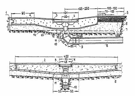 Рис. 9. Конструкция тальвежного колодца; 1 - щебеночная отмостка с пропиткой битумом на 6 - 8 см; 2 - решетка; 3 - стенка колодца; 4 - перепуск; 5 - шлаковая подушка; 6 - слой цементного раствора; 7 - водоустойчивый грунт; 8 - прокладка из просмоленной пеньки толщиной 1 - 1,5 см Рис. 10. Конструкция дождеприемного колодца мелкого заложения (вариант с одной решеткой); 1 - аэродромное покрытие; 2 - железобетонная лотковая плита; 3 - заделка щелей цементным раствором состава 1:3; 4 - решетка; 5 - отмостка из щебня с пропиткой битумом на 6 - 8 см; 6 - песчаное основание; 7 - закромочная дрена; 8 - перепуск; 9 - стыковая муфта; 10 - сварное колено из стальных труб с антикоррозийной обмазкой: 11 - прокладка из просмоленной пеньки; 12 - изоляционный слой из битумной мастики; 13 - поверхность дна корыта под лотковыми плитами без дождеприемников; 14 - поверхность дна корыта, под плитами с дождеприемными воронками