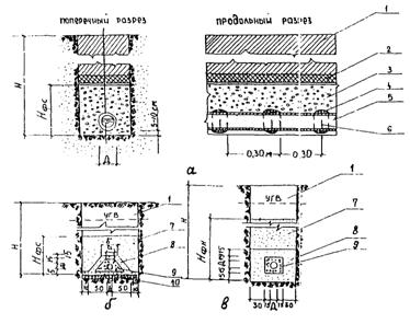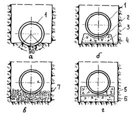 Рис. 14. Схемы укладки труб коллекторов: а - на спланированный и уплотненный грунт; б - на сборное основание из железобетонных блоков; в - на гравийное или щебеночное основание; г - на монолитное бетонное или железобетонное основание: 1 - труба коллектора; 2 - цементный раствор 1:3 - 1:4; 3 - сборное основание из железобетонных блоков; 4 - цементный раствор 1:6 - 1:8; 5 - цементный раствор; 6 - монолитное бетонное или железобетонное основание; 7 - щебеночное, гравийное или песчаное основание На слабых грунтах основание под асбоцементные трубы проектируется из слоя утрамбованного щебня толщиной 10 см. Бетонные и железобетонные трубы диаметром 300 - 600 мм должны укладываться, как правило, на сборные железобетонные элементы, а трубы диаметром более 600 мм, как правило, на основание из монолитного бетона или железобетона. Необходимая толщина основания устанавливается расчетом на прочность. Минимально допустимая толщина основания 15 см. 3.17. На участках прохождения коллекторов под искусственными покрытиями траншеи должны устраиваться с вертикальными стенками и креплением. Обратная засыпка производится песчаным грунтом. Пересечение искусственных покрытий коллектором целесообразно проектировать под углом 90° к продольной оси покрытия. 3.18. Взаимное расположение водосточных коллекторов с другими инженерными сетями следует выполнять в соответствии с требованиями главы СНиП по проектированию генеральных планов промышленных предприятий. 3.19. Ширину траншеи и откосы следует принимать в соответствии с главой СНиП "Земляные сооружения. Правила производства и приемки работ". 3.20. При наличии особых условий (скальные, торфянистые и просадочные грунты) разрабатывается индивидуальная конструкция основания. Бетонные и железобетонные безнапорные трубы во всех грунтах, за исключением скальных, плывунных, болотистых и просадочных II типа, допускается укладывать непосредственно на выровненное и утрамбованное дно траншеи или основание из уплотненных сыпучих материалов. 3.21. Колодцы, смонтированные на коллекторах (рис. 15), устанавливаются в начале коллекторов, на углах поворота, в местах изменения уклонов, в местах подключения к коллекторам перепусков или других водоотводных линий и на прямых участках на расстояниях: 50 м при диаметре труб до 250 мм; 75 м -"- 250 - 400 мм; 100 м -"- 400 - 600 мм; 125 м -"- более 600 мм. Форма смотровых колодцев может быть круглой или прямоугольной, ее выбор зависит от количества, диаметров и углов поворота подключенных труб. Минимальные диаметры круглых колодцев должны быть на трубопроводах диаметром: до 600 мм 1000 мм 700 мм 1250 мм 800 - 1000 мм 1500 мм 1200 мм 2000 мм
