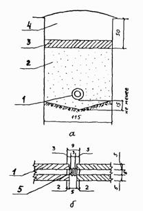 Рис. 13. Конструкция дренажа из трубофильтров: а - поперечный разрез; б - эластичное соединение трубофильтров; 1 - трубофильтр диаметром 50 мм; 2 - песок; 3 - дерн; 4 - хорошо уплотненный глинистый грунт; 5 - эластичное пластмассовое соединение 3.11. Перепуски от дождеприемных и тальвежных колодцев к коллектору следует проектировать из асбестоцементных труб с условным диаметром 150 - 400 мм, уклоном 0,02 - 0,03 от дождеприемных колодцев и 0,005 - 0,030 - от тальвежных. Длина перепуска должна быть для дождеприемного колодца не более 40 м, а для тальвежного не более 20 м. 3.12. Коллекторы устраиваются из асбоцементных, бетонных и железобетонных труб, располагаемых вдоль кромок искусственных покрытий на расстоянии не менее 5 м от них. Применяемые трубы должны отвечать требованиям ГОСТ 1839-72*, 539-73*, 6482-71*, 16953-71, 12586-74, ТУ-33-6-75, 18599-73. Параметры труб приведены в приложении 2. Допускается применение труб из других материалов, если обеспечивается их прочность и устойчивость путем расчета. Минимальный диаметр коллекторов по условному проходу - 200 мм, минимальный уклон - 0,003. При диаметрах труб 500 мм и более в соответствии с гидравлическим расчетом возможны меньшие уклоны. Сопряжение труб по трассе коллекторов (в вертикальной плоскости) должно выполняться "шелыга в шелыгу". Минимальная глубина заложения труб коллекторов определяется их прочностью и должна быть не менее глубины промерзания. Допускается укладка труб в зоне промерзания на минимальной, по условию прочности, глубине. В этом случае коллекторы проектируются с максимально возможными уклонами, а в необходимых случаях предусматривается утепление труб. 3.13. При устройстве коллекторов в агрессивных средах должны проводиться противокоррозионные мероприятия: стальные трубы должны быть покрыты снаружи антикоррозийной изоляцией, на участках возможной электрокоррозии следует предусматривать катодную защиту трубопроводов. 3.14. Керамические трубы (ГОСТ 8411-74 и 286-74) на аэродромах классов А - Г могут применяться для устройства дренажно-водосточной сети только за пределами летного поля. 3.15. Стыковые соединения безраструбных бетонных труб выполняются в виде поясков из рулонного материала (пергамина, толи, рубероида), наклеиваемого битумной мастикой на предварительно очищенную поверхность труб с последующей обмазкой наклеенного пояска битумом. Стыки керамических и железобетонных труб промышленного изготовления заделываются просмоленной паклей и битумной мастикой. Стыки железобетонных предварительно напряженных труб уплотняются резиновыми кольцами. 3.16. Основания под трубами, независимо от их конструкции, должны обеспечивать опирание труб по всей их длине с охватом трубы не менее 90° по окружности (рис. 14). Асбестоцементные трубы диаметром 150 - 500 мм укладываются на спланированное уплотненное грунтовое и песчаное основание (коэффициент уплотнения для песчаных и суглинистых грунтов - 0,95 - 0,98, для глинистых - 1,0).