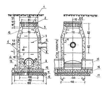 Рис. 15, Конструкция круглого смотрового колодца с заглубленной крышкой (сборный из железобетонных звеньев).: 1 - крышка: 2 - заделка мятой глиной слоем 10 см; 3 - отверстия 18×6×2 см; 4 - среднее бетонное кольцо с гнездом для перепуска; 5 - скобы Ø 16 мм; 6 - перепуск; 7 - битум; 8 - просмоленная пенька δ =1, 0 - 1,5 см; 9 - бетонный лоток (набивается на месте); 10 - железобетонное днище; 11 - щебеночная подготовка; 12 - цементный раствор; 13 - нижнее бетонное кольцо (бетонируется на месте); 14 - труба коллектора; 15 - горловина; 16 - сборное основание под трубы; 17 - температурный шов δ = 2 см Минимальные размеры прямоугольных колодцев в зависимости от трубы наибольшего диаметра D должны быть на трубопроводах диаметром до 700 мм - длина 1000 мм, ширина D + 400 мм, но не менее 1000 мм; на трубопроводах диаметром 700 мм и более - длина D +400 мм, ширина - D+500 мм. 3.22. Смотровые колодцы устраиваются, как правило, из железобетонных звеньев (крышек, горловин для круглых труб, средних звеньев и днищ). Нижнюю часть колодцев из-за ее нестандартности по высоте следует сооружать на месте из бетона монолитно с днищем. На коллекторах с загрязненными водами предусматриваются колодцы с отстойниками глубиной 0,3 - 0,5 м. 3.23. При пересечении коллектором грунтовых ВПП смотровые колодцы следует предусматривать с крышками, заглубленными в грунт не менее чем на 40 см. В остальных случаях, в том числе колодцы коллекторов, идущих вдоль кромок ИВПП, устраиваются с крышками, выходящими на дневную поверхность и отмосткой вокруг них шириной 1 м из щебня с пропиткой. При заглубленном варианте крышка смотрового колодца изолируется. Прямоугольные смотровые колодцы с решетчатой крышкой и отстойником глубиной 0,3 - 0,5 м устраиваются в пониженных местах рельефа для отвода поверхностных вод. В этом случае они выполняют роль тальвежных колодцев. 3.24. Быстротоки и перепады устраиваются на канавах с уклоном более 0,05 - 0,10. По своей конструкции быстротоки представляют собой лотки с большими уклонами из материала, обеспечивающего пропуск воды с большими скоростями (обычно бетон и железобетон), а перепады - лотки с вертикальными или близкими к вертикальным уступами. В конце быстротока, а также на каждой ступени перепада следует предусматривать гасители энергии потока. 3.25. Оголовки (обычно бетонные или железобетонные) устанавливаются в местах примыкания коллекторов к открытым водоотводным канавам (выходные оголовки) и в местах поступления воды из открытых канав в коллекторы (входные оголовки). Соединения труб с оголовками выполняются эластичными. В местах устройства оголовков водоотводные канавы укрепляются мощением на длину 3 - 10 м. Превышение лотка трубы над дном водоотводной канавы в выходных оголовках должно быть достаточным (не менее 30 см), чтобы исключить возможность подпора вода в коллекторе. При необходимости на выходах коллекторов в канавы следует устраивать гасители энергии потока. При неблагоприятных гидрогеологических условиях и больших размерах выходные оголовки рассчитываются на прочность и устойчивость как подпорные стенки. 3.26. Водоотводные канавы проектируются за пределами аэродромов, как правило, по кратчайшим расстояниям от оголовков до водоприемников. Уклоны дна канав, как правило, следует принимать не менее 0,002. Уклоны менее 0,002 допускаются на основании гидравлических расчетов только при соблюдении минима