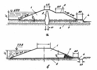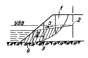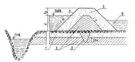 Рис. 16. Схема поперечного разреза ограждающей дамбы: 1 - водопроницаемый грунт; 2 - водонепроницаемый грунт; 3 - зуб из водонепроницаемого грунта; 4 - укрепленный откос; 5 - дамба; 6 - аккумулирующий бассейн, hз - запас высоты дамбы Высота ограждающих дамб принимается не менее чем на 0,5 и выше расчетного уровня высокой вода (РУВВ) с учетом высоты волны и высоты набега ее на откос дамбы. Заложение откосов и вид их укрепления принимается в соответствия с данными, приведенными в табл. 2 и 3 приложения 3. 4. ГИДРАВЛИЧЕСКИЙ РАСЧЕТ ВОДООТВОДНЫХ СИСТЕМ НА АЭРОДРОМАХ4.1. Путем гидравлического расчета водоотводных систем размеры сечений труб, лотков, канав определяются в зависимости от расчетных расходов. Водоотводные системы рассчитаны на сток дождевых и талых вод. Водоотводные системы ИВПП, РД, МС, перронов, принимающие воду только с покрытий, с покрытий и грунтовых обочин, а также с покрытий, грунтовых обочин и грунтовых водосборов шириной 200 - 300 м, рассчитывают на дождевой сток. Системы, принимающие воду с покрытий, грунтовых обочин, грунтовых водостоков шириной более 200 - 300 м, рассчитывают на сток талых вод. В отдельных случаях при больших грунтовых водосборах расчетный случай устанавливается проверкой работы систем на оба стока. 4.2. Проектные уклоны определяются с учетом допустимых скоростей движения воды и уклонов местности. Допускается минимальная скорость воды в трубах коллекторов 0,6 м/с, максимальная - 5 м/с. Минимальная скорость движения воды в канавах должна быть не менее половины гидравлического радиуса потока R в м. Максимальные скорости воды в канавах и грунтовых лотках не должны превышать значений, указанных в табл. 1 приложения 4. 4.3. Расчет водоотводных систем на дождевой сток следует производить по методу предельных интенсивностей. По этому методу расчетный расход Q равен Q = S∙F, (2) где F - площадь водосбора для рассчитываемого сечения; S - величина стока. Величина стока S равна