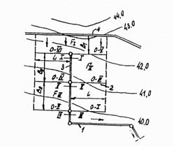 Рис. 18. Гидравлический расчет осушительной сети: 1 - коллектор; 2 - осушитель; 3 - собиратель; 4 - нагорная канава Время τ'скл определяется по формуле (5) или по номограмме, приведенной на рис. 3 приложения 6. Время τ'ос и τ'с вычисляется делением длины осушителя и собирателя на скорость течения воды в трубах. Для определения времени добегания воды по осушителю скорость можно принимать 0,5 м/с. Минимальная расчетная скорость для собирателей принимается такой же, как и для коллекторов, - 0,6 м/с. По вычисленного τ и параметру Δ определяется величина стока SI, расчетный расход QI и по проектному уклону определяется диаметр собирателя на первом уклоне. Расчетный расход для сечения II - II второго участка равен QII = SIIFII Время добегания τ2 до сечения II - II равно сумме времени добегания дождевых вод τ1, до сечения I - I и времени добегания по собирателю до сечения II - II: τ2 = τ1 + τ"с. По расчетному времени добегания и параметру Δ определяются величина стока SII и расчетный расход QI, а затем диаметр собирателя для второго участка. Расчетные расходы в сечениях коллекторов, отводящих воду с грунтовых водосборов, определяются так же, как и для собирателей. Сечения собирателей и коллекторов рассчитываются в таком же порядке до тех пор, пока расчетное время добегания дождевых вод не станет равным продолжительности стокообразования, т.е. τ = τст. Для сечений, удаленных по времени добегания на τ > τст, расчетный расход определяется с учетом дополнительного расхода по формулам (14) и (15). При расчете систем на сток талых вод величина стока с 1 га (S) определяется при средней толщине снегового покрова и средней продолжительности снеготаяния при коэффициенте стона 0,80 - 0,90 или находится по картограмме распределения максимального элементарного стока талых вод А мм/ч. приведенной на рис. 6 приложения 5. Расчет глубинного дренажа4.29. При проектировании мероприятий по понижению уровня грунтовых вод под искусственными покрытиями и на отдельных грунтовых участках летного поля наиболее часто встречаются следующие случаи расчета горизонтального глубинного дренажа (рис. 19): систематического дренажа, рассчитываемого на случай, когда подземные воды пополняются за счет инфильтрации атмосферных осадков и не имеют ясно выраженного направления потока; однолинейного и кольцевого (контурного) дренажей, рассчитываемых на понижение уровня потока грунтовых вод. 4.30. При неглубоком залегании водоупора предусматривается дренаж совершенного типа, укладываемый на поверхность водоупора для полного перехвата подземных вод. При глубоком залегании водоупора предусматривается дренаж несовершенного типа, закладываемый выше водоупора.