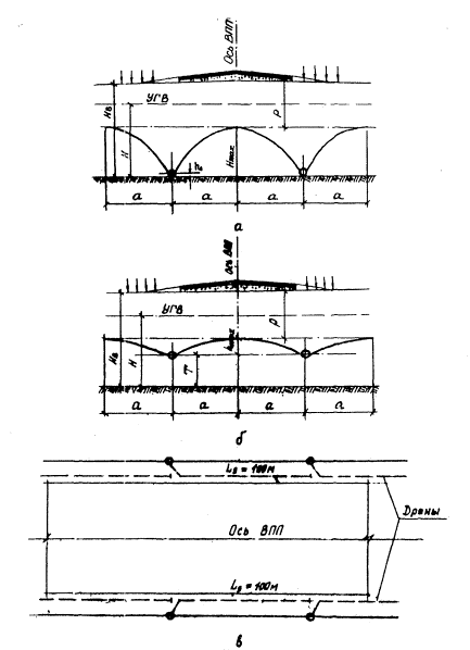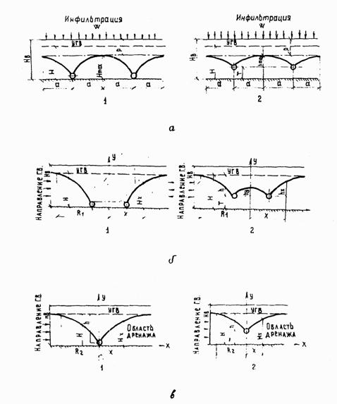 Рис. 19. Расчетные схемы глубинного дренажа: а - систематический; б – кольцевой (контурный); в - однолинейный; 1 - совершенный; 2 – несовершенный 4.31. Расчет систематического дренажа заключается в определении: расстояний между дренами, обеспечивающих понижение уровня грунтовых вод до принятой нормы осушения Р; расчетного расхода вода, поступающей в дрены. 4.32. Расчетный расход Q в дренаже совершенного и несовершенного типа вычисляется по формуле Q = 2aWLg (32) где 2а - расстояние между дренами; Lg - длина дрены; W - интенсивность инфильтрации атмосферных осадков или других вод в грунте (при отсутствии опытных данных значение W принимается по табл. 4 приложения 4). Расстояния между дренами определяются по формулам: при совершенном дренаже