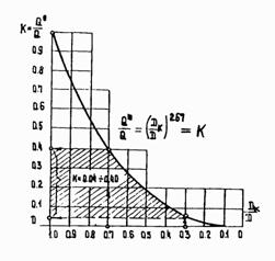 Значение 4.37. Расчеты дренажей других систем и типов, а также дренажей, устраиваемых в сложных гидрогеологических условиях (в напорных грунтовых водах, водоносных пластах большой мощности, вблизи, водоемов и т.п.), следует производить методами, изложенными в специальной технической литературе. 4.38. Гидравлические расчеты труб глубинного дренажа заключаются в проверке наполнения труб и скоростей течения воды. Скорость течения воды в дренаже должна быть в пределах 0,15 + 1,0 м/с, а глубина наполнения - от 0,05 до 0,95. Расчет регулирующих бассейнов4.39. Регулирующие бассейны устраиваются для снижения диаметров труб коллекторов (особенно главных коллекторов) и рассчитываются на сток дождевых вод. В результате определяется: величина коэффициента уменьшения расхода, пропускаемого коллектором; необходимая емкость бассейна; размеры запруды, образующейся на местности; время опорожнения регулирующего бассейна от воды. 4.40. Коэффициент К уменьшения расхода, пропускаемого коллектором, устанавливается, исходя из отношения диаметра труб Dк/D. где D - потребный диаметр труб коллектора при отсутствии бассейна; Dк - диаметр труб коллектора при устройстве бассейна (см. рис. 21). Значение коэффициента К рекомендуется принимать в пределах 0,04 - 0,40. 4.41. Необходимая емкость регулирующего бассейна определяется по формуле W = Q0T0f(K), (49) где Q0 - расчетный расход в сечении коллектора в месте создания бассейна при времени добегания воды к этому сечению τ0 мин.