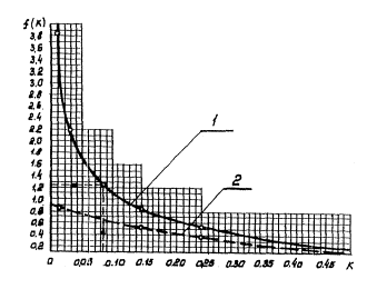 Рис. 22. График определения f(К): 1 при t = τ – τ0; 2 - при t =τ > τ0 В других случаях размеры запруды устанавливаются в соответствии с принятой глубиной воды по плану в горизонталях. 4.43. Время опорожнения регулирующего бассейна от воды определяется по формуле