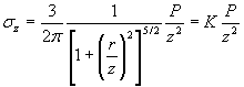 Dвн - внутренний диаметр трубы, м; δ - толщина стенок трубы, м; γ - объемный вес материала трубы, т/м. 5.9. За временную нагрузку трубы принимается нормативная статическая нагрузка в соответствии с расчетным типом самолета. Для вычисления давления на трубу, передающегося от нагрузки, приложенной на поверхности земли, применяется решение пространственной задачи теории упругости. Для этого следует использовать формулу для определения вертикальных напряжений в любой точке массива от сосредоточенной силы, приложенной на поверхности однородного упругого полупространства. Горизонтальными составляющими давления из-за их малой величины можно пренебречь. 5.10. Формула для определения вертикальных напряжений имеет вид: