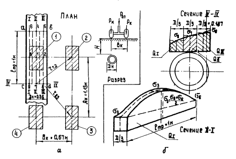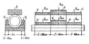 Рис. 24. Расчет оснований под трубы 5.26. Изгибающий момент от действия колеса, центр отпечатка которого совпадает с расчетным сечением, следует определять по формуле