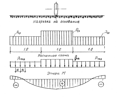 Рис. 23. Схема нагрузки основания (при передаче нагрузки через три звена труб и выступы оснований) При высоте засыпки над верхом трубы 2 м и более, когда расчет производится для 5 звеньев труб, чтобы определить нагрузку на крайние звенья, не следует разбивать след колеса на ряд площадок, так как такая разбивка не оказывает ощутимого влияния на точность определения расчетного напряжения на крайние звенья трубы. В данном случае нагрузку, приходящуюся на одно колесо, следует принимать за сосредоточенную и приложенную в центре следа колеса. 5.21. Нагрузку на отрезки основания следует определять путем умножения расчетного напряжения на площадь выступов по формуле Р2 = 2вlσ, (73) где Р2 - нагрузка на выступы основания одного звена трубы; в - ширина выступа; l - длина выступа, равная длине звена трубы; σ - расчетное напряжение на поверхности выступа, 5.22. Общая расчетная нагрузка на основание равна сумме временных нагрузок, передающихся на соответствующе трубы и выступы: Р = P1экв + P2экв, (74) Р1экв = Р1ср + Р2ср; Р2экв = Р1кр + Р2кр Общий вид нагрузок показан на рис. 24. 5.23. Расчет оснований под трубой следует производить в продольном и поперечном направлениях. 5.24. При расчете в продольном направлении нагрузку, передаваемую через трубы и выступы основания, следует заменять рядом сосредоточенных сил (см. рис. 24). Основание рассчитывается как бесконечная балка прямоугольного сечения, лежащая на упругом основании, характеризующимся моделью Виндлера. Основание разбивается температурно-усадочными швами на отдельные участки длиной 30 - 50 м. Участки между собой соединяются штырями, препятствующими смещению концов основания. Таким образом, основание в продольном направлении представляет собой ряд шарнирно соединенных балок, лежащих на упругом основании. Расчетный изгибающий момент в основании под трубами определяется по формуле