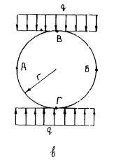 где φ - угол внутреннего трения грунта засыпки; ВТ - расчетная ширина траншеи на уровне верха трубы. Величина ВТ принимается по табл. 2 приложения 8 при ВТ менее некоторой переходной ширины Впер; при ВТ > Впер в расчет вводится переходная ширина траншеи Впер, т.е. ширина траншеи, при которой нагрузка на трубу достигает максимума и при дальнейшем уширении траншеи не возрастает. Значение 5.8. Влияние собственного веса трубы является второстепенным фактором. В расчете тонкостенных асбестоцементных труб им можно пренебречь. При расчете бетонных и железобетонных труб, обладающих значительным весом, нагрузку от собственного веса удобнее заменить эквивалентной равномерно распределенной нагрузкой. Величина эквивалентной равномерно распределенной нагрузки составляет 80 % от собственного веса трубы. Ее значение определяется по формуле G = 0,80G0 = 0,80∙2πrcpδγ, (61) где G - эквивалентная равномерно распределенная нагрузка от веса трубы, т./пог. м; G0 - собственный вес трубы, т/пог. м;