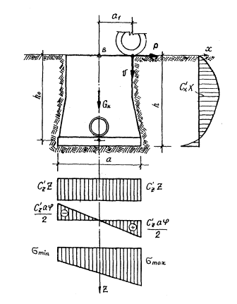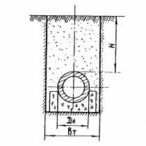 где H1, H2...Hп; φ1, φ2…φп - соответственно сток осадков и коэффициенты стока за-отдельные месяцы; Hn(1), Hn(2)…Hn(n); Hφ(1), Hφ(2)…Hφ(n) - слой потерь воды на испарение и фильтрацию бассейна; F - площадь водосбора. 4.47. Максимальная глубина бассейна hmax определяется по формуле hmax ≈ 2hcp. (56) Значения величин, входящих в формулы для определения FБ и hcp, принимаются по климатическим и грунтовым условиям расположения аэропорта. Потери воды на инфильтрацию и фильтрацию из бассейна могут быть подсчитаны через коэффициент стока Hφ = (l - φ)H, при принятии φ одинаковым для площадей водосбора и бассейна. Глубина бассейнов целесообразна не менее 0,5 м. 5. ПРОЧНОСТНЫЙ РАСЧЕТ ВОДООТВОДНЫХ СИСТЕМ НА АЭРОДРОМАХ5.1. К элементам водоотводных систем, рассчитываемых на прочность, относятся трубы, основания под трубы и колодцы (смотровые, тальвежные и дождеприемные). В отдельных случаях (при значительных размерах и сложных гидрогеологических условиях) необходимо производить также прочностный расчет оголовков. 5.2. Конструкции элементов водоотводных систем рассчитываются на воздействие вертикальных самолетных нагрузок и веса грунта, как сооружений, заглубленных в грунт. Расчет производится по методу предельных состояние, являющимися для бетонных сечений предельным состоянием по прочности, для железобетонных сечений - предельным состоянием по прочности и раскрытию трещин. 5.3. Конструкции элементов водоотводных систем, как правило, следует рассчитывать на нормативную самолетную нагрузку, параметры которой приведены в главе СНиП "Аэродромы. Нормы проектирования". При существенном отличии параметров нагрузки расчетного самолета от параметров нормативной нагрузки расчет следует производить на нагрузку от расчетного самолета. 5.4. Для проведения расчетов должны быть определены: категория нормативной, нагрузки, число колес на условной опоре, давление в пневматиках или параметры нагрузки расчетного самолета; характеристика района строительства, географическое положение, данные о грунтах, уровень грунтовых: вод, глубина промерзания и т.д. 5.5. В процессе расчета устанавливаются параметры расчетных сечений - толщина элементов конструкций, расположение и площадь сечения арматуры. Расчет труб, уложенных в земле5.6, Цель расчета состоит в том, чтобы установить такое заглубление труб или подобрать такое сечение стенок труб, которые гарантировали бы трубы от разрушения. Расчет труб на прочность по методу предельных состояний сводится к удовлетворению условия Мрасч. ≤ Мпр (57) где Мрасч. - расчетный изгибающий момент в сечении стенки трубы; Мпр - предельный изгибающий момент в сечении стенки трубы (предельная несущая способность сечения стенки трубы на изгиб). Значение расчетного момента Мрасч определяется при действии общей нагрузки на трубу. Общая нагрузка, действующая на трубу, слагается из постоянной и временной нагрузок. Постоянная нагрузка включает вес засыпки грунта над трубой и собственный вес трубы. Временная нагрузка возникает при действии колеса самолета на трубу (при передаче нагрузки через грунт). 5.7. Постоянная нагрузка от засыпки на трубу, уложенную в траншею, определяется в зависимости от свойств засыпки, высоты ее над верхом трубы и ширины траншеи на уровне верха трубы по формуле Q = KТγНВT, (58) где Н - высота засыпки над верхом трубы; γ - объемный вес грунта засыпки.