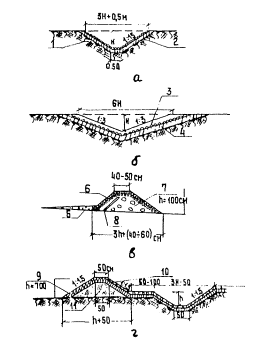 Рис. 12. Варианты конструкций глубинных дрен: а и б - дрены совершенного типа; в - дрена несовершенного типа; 1 - местный грунт; 2 - дернина; 3 - фильтрующая засыпка; 4 - слой мха, очесы или минеральная вата; 5 - труба асбестоцементная D = 100 мм; 6 - щель (пропил) в трубе; 7 - песок с коэффициентом фильтрации не менее 7 м/сут.; 8 - песок; 9 - щебень; 10 - щебень, втрамбованный в грунт Водоприемные щели или отверстия в дренажных трубах устраиваются сбоку или снизу трубы, щели устраиваются в виде пропилов на 1/3 ее диаметра на расстоянии 30 см друг от друга или в виде отверстий той же площади. Стыки и прорези труб во избежание их заиления обкладываются очесами или минеральной ватой. Стыки труб соединяются между собой без уплотнения. 3.7. В закромочных дренах фильтрующая обсыпка укладывается на всю высоту от трубы до верха дренирующего слоя основания, в глубинных дренах - на высоту, обеспечивающую устройство фильтрующей обсыпки (см. рис. 12). При использовании этих дрен как закромочных дренирующий слой основания доводится до дрен. Рекомендуется засыпку нижней части закромочных дрен на глубину до верха труб выполнять из крупнозернистого материала с коэффициентом фильтрации большим, чем материала дренирующего основания. 3.8. Фильтрующие обсыпки труб глубинного дренажа в соответствии с составом дренирующих грунтов могут быть однослойными или многослойными. Высота засыпки совершенного дренажа Нфс принимается равной 0,6 глубины Н, но не менее D +50 см, высота засыпки несовершенного дренажа Нфн принимается равной 0,7 глубины Н, но не менее D + 75 см, где D - наружный диаметр трубы. При расположении дренажа в песках гравелистых, крупных и средней крупности должны проектироваться однослойные обсыпки из гравия или щебня, а в мелких и пылеватых песках, супесях и при слоистом строении водоносного пласта - многослойные обсыпки. Для внутреннего слоя фильтрующих обсыпок применяется гравий, а при отсутствии его - щебень изверженных горных пород или особо прочные разновидности осадочных пород (кремнистые известняки и хорошо сцементированные невыветрившиеся песчаники). Для внешнего слоя обсыпок применяются крупнозернистые пески. 3.9. Вокруг дренажных труб устраивается фильтрующая обсыпка подобранного состава из гравия или щебня. Обсыпка должна обладать достаточной водозахватывающей способностью для приема поступающей воды. Подбор фракций фильтрующих обсыпок должен производиться в зависимости от типа фильтра и состава дренирующих грунтов из условия, чтобы частицы дренирующего грунта не вымывались и не заиливали обсыпки, а трубы и фильтры не засорялись. Для предотвращения заиливания засыпки необходимо, чтобы