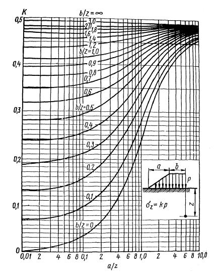 где z - расстояние от поверхности трубы до точки, в которой определяется вертикальное напряжение; P - величина сосредоточенной силы, приложенной на поверхности грунта; r - горизонтальная проекция расстояния от точки, в которой определяется вертикальное напряжение, до точки приложения силы. Значения коэффициента К приведены в табл. 4 приложения 8. 5.11. При определении напряжений от колес самолета пользуются методом суммирования напряжений. Эллипсовидный отпечаток колеса заменяется прямоугольным и разбивается на ряд отдельных площадок, в центре которого прикладываются сосредоточенные силы, эквивалентные по величине равномерно распределенной нагрузке, приходящейся на данные площадки, В интересующей точке грунта напряжение от колес определяется суммированием напряжений от каждой отдельной сосредоточенной силы. Площадь отпечатка пневматика F следует определять по формуле