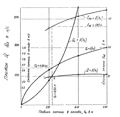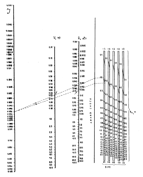 где hЛ - глубина потока в лотке в низовом сечении расчетных участков (у дождеприемных и тальвежных колодцев); J - уклон дна лотка. Глубину потока hA для лотков в кромках покрытий ориентировочно можно принимать на 1 - 2 см менее глубины лотка. При точных расчетах указанную глубину следует находить подбором, исходя из условия равенства расчетного расхода пропускной способности лотка при принятой глубине потока. Пропускная способность лотка Qo определяется по формуле (или номограмме на рис. 5 приложения 6) Qo = ω∙Vлот, (9) где ω - площадь живого сечения потока в лотке, м2. Значение ω в лотке треугольного сечения определяется по формуле
