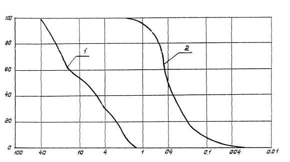 Рис. 21. График для определения коэффициента уменьшения расходов К Функция f(К) определяется в соответствии с кривой I на рис. 22. 4.42. Площадь запруды, образующейся на местности, зависит от существующего рельефа в месте создания бассейна и принятой допустимой глубины воды над водоприемным колодцем, т.е. максимальной глубины запруды. Площадь запруды F в пологой замкнутой пониженности рельефа при глубине воды h над водоприемным колодцем может быть определена по формуле