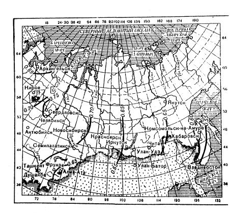 Рис. 1. Деление территории СССР на климатические зоны Грунтово-напорное питание обусловлено притоком грунтовой напорной воды по водоносному слою, перекрытого слоем слабопроницаемого грунта (глины, суглинка). Напор воды создается за счет подпора воды в близлежащих водоемах или при стоке грунтовой воды с более возвышенных участков. Пучинное питание вызывается оттаиванием весной ледяных кристаллов и линз, накопленных в грунте за зимний период. Все типы водного питания могут встречаться как в обособленном виде, так и в сочетании нескольких из них. 2. ПРОЕКТИРОВАНИЕ ВОДООТВОДА И ДРЕНАЖА НА АЭРОДРОМАХ2.1. Задачами проектируемых мероприятий по водоотводу и дренажу являются: защита территории аэродрома и участков искусственных покрытий от затопления притоком ливневых и талых вод, стекающих со смежных водосборов, а также притоком воды из ближайших водоемов при подъеме уровня; улучшение стока, сбор поверхностных вод из замкнутых понижений и других переувлажняемых мест, а также вод, стекающих с покрытий и прилегающих к ним грунтовых водосборов; понижение уровня грунтовых вод под искусственными покрытиями и на отдельных грунтовых участках при наличии их высокого уровня; перехват грунтово-напорных вод, поступающих к летному полю с территории, примыкающей к аэродрому; сбор и отвод избыточной воды из дренирующих и грунтовых оснований искусственных покрытий. 2.2. Водоотводные и дренажные системы аэродромов должны проектироваться с учетом следующих основных принципов: влаги от уровня грунтовых вод, стекающих и частично застаивающихся на водоупорном слое. обеспечение безопасности выполнения взлетно-посадочных операций самолетов, что достигается правильным расположением водоотводных и дренажных систем в плане и необходимой прочностью их конструкции; обеспечение экономичности проектируемых мероприятий, которое достигается введением наиболее дешевых и эффективных мероприятий по водоотводу и дренажу территории аэродрома; использованием сборных конструкций из элементов заводского изготовления; проектированием водоотводной и дренажной системы наименьшей протяженности, с минимальным пересечением аэродромных покрытий; обеспечение возможности перспективного развития аэродрома без существенного переустройства водоотводной и дренажной сети. 2.3. Перехват и отвод поверхностных вод, поступающих к аэродрому с внешних водосборов, осуществляется с помощью нагорных канав, расположенных за пределами летного поля. Для защиты территории аэродрома от подтопления грунтовыми водами с внешних водосборов могут устраиваться ловчие канавы или дрены. Защита территории аэродрома от затопления водой из близлежащих водоемов при поднятии в них уровня воды может обеспечиваться устройством ограждающей дамбы или планировочными решениями, защита от подтопления - устройством водонепроницаемого экрана в толще водоносного слоя, устройством береговой дрены и другими сооружениями. Расчетный уровень высокой воды (РУВВ) при необходимости защиты аэродрома от затопления паводковыми водами следует принимать с вероятностью превышения 1:100 для аэродромов классов А, Б и 1:50 для аэродромов других классов. 2.4. Для предупреждения переувлажнения грунтов поверхностной и грунтовой водой должна проектироваться соответствующая водосточно-дренажная сист