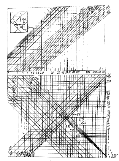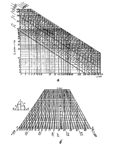 где Ψ - коэффициент стока; Δ - параметр, равный интенсивности одноминутного дождя принятой повторяемости, мм/мин; t - продолжительность дождя, равная времени добегания воды до рассчитываемого сечения, мин; п - показатель степени, характеризует изменение расчетных интенсивностей дождей по времени. Величина S может быть определена по номограмме на рис. 1 приложения 6. 4.4. Коэффициент стока Ψ при расчете сетей на дождевой сток принимается равным 0,95 - для асфальтобетонных, 0,85 - для цементобетонных покрытий; 0,60 - для щебеночных материалов, обработанных органическими вяжущими; 0,40 - для щебеночных и гравийных материалов, не обработанных вяжущими. Коэффициент стока для грунтовых поверхностей следует принимать при отсутствии дернины для супеси - 0,25; суглинка - 0,30; глины - 0,35; с дерниной для супеси - 0,15; суглинка - 0,20; глины - 0,25. Для грунтовых обочин аэродромных покрытий коэффициент стока принимается равным для супеси - 0,60; суглинка - 0,65; глины - 0,70. При разнородных поверхностях коэффициент стока принимается как средневзвешенная величина пропорционально площади участка с разнородными поверхностями. 4.5. Значение параметра Δ равно