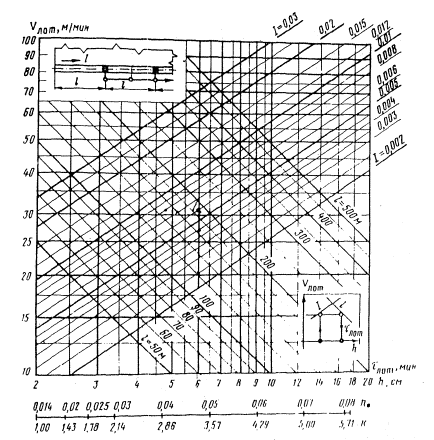 где lлот - длина участка лотка, м; Vлот - скорость движения дождевых вод в конце лотка, м/с. Значение Vлот определяется по формуле (или по номограмме на рис. 4 приложения 6)