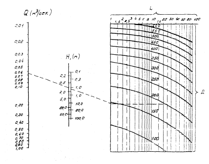 Рис. 20. Расчет высоты высачивания вода 4.36. Расчет однолинейного дренажа заключается в определении: положения пониженного уровня грунтовых вод в области дренажа; расчетного расхода воды, поступающей в дрену. Расчетный расход дрены Q. определяется по формуле Q = Q0Lg, (43) где Lg - длина дрены, м. Расход (дебит) воды на 1 пог. м дренажа Q0 определяется по формулам при безнапорных условиях: при совершенном дренаже