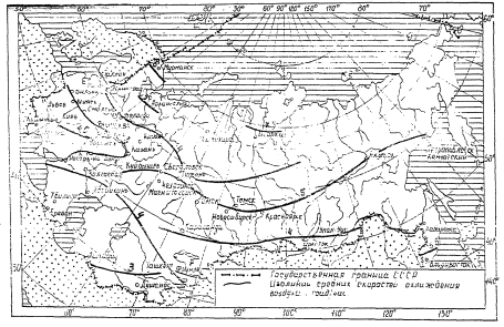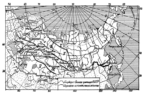 Примечание. Кубань и западную часть Северного Кавказа следует относить к III дорожно-климатической зоне. Черноморское побережье, предкавказские степи, за исключением Кубани и западной части Северного Кавказа, следует относить к IV зоне. Горные области, расположенные выше 1000 м над уровнем Моря, а также малоизученные, районы следует относить к той или иной зоне в зависимости от местных природных условий. Рис. 1. Схема, деления территории СССР на климатические зоны