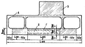 Примечания: 1. Знак "плюс" означает целесообразность, а знак "минус" - нецелесообразность применения конструкции покрытия данного типа. 2. Сборные покрытия из железобетонных предварительно-напряженных плит следует преимущественно применять: на участках, подверженных неравномерному пучению или просадкам; при реконструкции аэродромов; при необходимости строительства покрытий в сжатые сроки; на участках, где не могут быть эффективно использованы бетоноукладочные машины; при строительстве покрытий при отрицательных температурах наружного воздуха. Сборные покрытия из предварительно-напряженных железобетонных дорожных плит типа ПДГ-2-6с и ПДГ-1,5-6с толщиной 14 см допускается применять при соответствующем технико-экономическом обосновании на участках группы Г взлетно-посадочных полос аэродромов под IV категорию нормативной нагрузки. 3. При соответствующем технико-экономическом обосновании допускается применять монолитные железобетонные покрытия - для III категории нормативной нагрузки на участках с пучинистыми и просадочными грунтами; монолитные бетонные однослойные покрытия - для V и VI категорий нормативных нагрузок; асфальтобетонные покрытия - для I категории нормативной нагрузки. 3.3 (6.12). Аэродромные покрытия следует проектировать для аэродромов (вертодромов), располагаемых на участках местности 1 и 2 типов всех дорожно-климатических зон. При необходимости строительства аэродромных покрытий на участках местности 3 типа следует предусматривать соответствующие инженерные мероприятия (осушение, понижение уровня грунтовых вод, возведение насыпей и др.) для приведения имеющихся гидрогеологических условий к условиям местности 2 типа. Рис. 2. Схема деления покрытий аэродрома на группы участков: А - магистральные РД концевые участки ИВПП; Б - участки, примыкающие к концевым участкам ИВПП, вспомогательные и соединительные РД, МС, перроны и другие аналогичные площадки для стоянки самолетов; В - средняя часть ИВПП; Г - краевые участки в средней части ИВПП. 3.4 (5.13). Покрытия аэродромов по степени воздействия нагрузок воздушных судов и несущей способности следует подразделять на группы участков в соответствии с рис.2. Приведенную схему, допускается уточнять в зависимости от назначения и ведомственной принадлежности аэродрома. Конструирование покрытий и основанийЖесткие аэродромные покрытия3.5 (5.14). Требуемые толщины конструктивных слоев жестких покрытий следует определять путем расчета в соответствии с установленной категорией нормативной нагрузки и принимать не менее для конструктивных слоев из предварительно-напряженного железобетона - 14 см; из предварительно-напряженного железобетона с двухосным обжатием при укладке поперечной арматуры в каналах 18 см; из железобетона с ненапрягаемой арматурой, армобетона и бетона - 16 см. Примечание. Для двухслойных покрытий и при усилении покрытий бетоном или армобетоном минимальную толщину слоя следует принимать не менее 20 см. 3.6 (5.15). Максимальную толщину однослойных жестких покрытий следует назначать, исходя из технической возможности бетоноукладочных комплектов и принятой технологии строительства. В случаях, когда по расчету требуется толщина покрытия больше допустимой, следует проектировать двухслойные покрытия. Двухслойные покрытия, кроме того, следует предусматривать при на