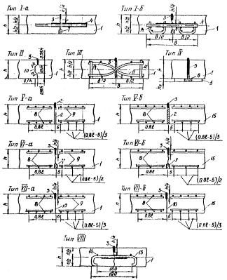 Вместо устройства стыковых соединений допускается предусматривать усиление краевых участков плит армированием или утолщением. Армирование краевых участков бетонных и армобетонных плит покрытий следует производить согласно табл. 25 (31). Необходимую площадь арматуры для краевых участков железобетонных плит с ненапрягаемой арматурой следует определять путем расчета в соответствии с величинами изгибающих моментов. Ширину зоны усиления краевых участков плит следует принимать равной 0,8ℓ, где ℓ - упругая характеристика плиты, определяемая согласно п. 3.51 (5.53). Примечания: 1. Продольные швы в монолитных железобетонных предварительно-напряженных покрытиях с двухосным обжатием устраиваются без стыковых соединений и усиления краевых участков. 2. Для двухслойных жестких покрытий ширину зоны усиления краевых участков верхней плиты следует определять в зависимости от ее упругой характеристики, условно принимая, что плита лежит на грунтовом основании. 3. Допускается уменьшать диаметр арматурных стержней до 12 мм при одновременном увеличении их количества сохраняя общую площадь сечения арматуры и минимальное расстояние между стержнями 10 см. Рис. 3. Схема конструкций деформационных швов: 1 - плита покрытия; 2 - деревянная прокладка; 3 - герметизирующий материал; 4 - штырь (обмазка битумом на 2/3 длины); 5 - подшовная плита; 6 - деревянная пробка диаметром 10-15 см; 7 - деревянная прокладка, устанавливаемая при невозможности нарезки паза до проектной глубины (1/4) при толщине плиты более 30 см; 8 - рабочая арматура; 9 - распределительная арматура; 10 - грань плиты, обмазанная битумной мастикой; 11 - изогнутые штыри; 12 - стойка; 13 - анкер диаметром 12-14 мм с обмазкой разжиженным битумом; 14 - монтажные стержни; 15 - армобетонная плита