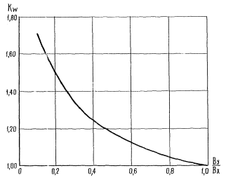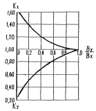 где ℓтр - значение требуемой упругой характеристики плиты, при котором соблюдается условие прочности (1); Kw - принимается по графику на рис. 13 в зависимости от отношения величин жесткостей плит покрытия в направлении осей У и X (Ву/Вх) или по табл. 1 настоящего приложения для типовых плит, сборных покрытий заводского изготовления; Kα - принимается по табл. 2 в зависимости от отношения радиуса круга, равновеликого площади отпечатка пневматика одного колеса опоры самолета, R к требуемой упругой характеристике плит покрытия ℓтр;