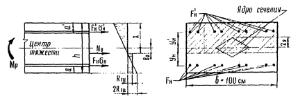 где mт - коэффициент точности натяжения арматуры, принимаемый согласно п. 1.28 главы СНиП II-21-75; Fн, F'н - площадь сечения напрягаемой арматуры, расположенной соответственно в растянутой и сжатой зонах сечения; σн, σ'н - величина предварительного напряжения в напрягаемой арматуре, расположенной соответственно в растянутой и сжатой зонах сечения; чЯ - расстояние от центра тяжести сечения до ядровой точки, наиболее удаленной от растянутой зоны, трещиностойкость которой проверяется (для прямоугольных сечений чЯ = h/6); ℓон - эксцентриситет равнодействующей No относительно центра тяжести сечения, определяется по формуле
