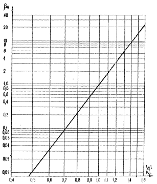 в Рис. 10. Расчетные схемы усилий и эпюры напряжений в сечениях плит: а - цементобетонных и армобетонных; б - армированных ненапрягаемой арматурой; в - армированных напрягаемой арматурой Рис. 11. График для определения эквивалентного числа приложений расчетной, нагрузки (на, прямых указано соотношение величия Mi/Мp) Рис. 12. График для определения коэффициента βN Рис. 13. График для определения коэффициента KW ρN - коэффициент учитывающий условия работы грунтовых, оснований жестких аэродромных покрытий при воздействии многократно повторяющихся нагрузок, принимаемый по графику на рис. 12 в зависимости от отношения прогибов в центре плиты Wi/Wp, вызываемых действием i-го и расчетного воздушных судов; при этом значения Wi и Wp следует определять по формуле