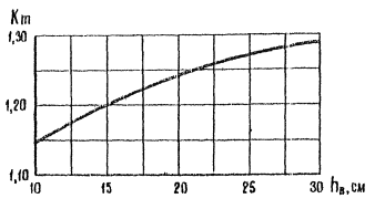 изгибающий момент Момент B = B1 + B2, (36) где B1 - жесткость плиты толщиной верхнего слоя hв; B2 - жесткость плиты толщиной нижнего слоя hн; K' - переходный коэффициент, принимаемый по табл. 32 (40) в зависимости от наличия и вида стыковых соединений; при устройстве в плитах со сквозными швами краевого армирования коэффициент K' следует принимать как для варианта со стыковым соединением; Ми - предельный изгибающий момент для нижнего слоя плиты, определяемый по формулам (19), (20) как для однослойных покрытий с введением к коэффициенту условий работы m поправочного коэффициента Km, принимаемого по графику на рис. 14 а зависимости от толщины верхнего слоя hв. Рис. 14. График для определения поправочного множителя Km при расчете двухслойных покрытий