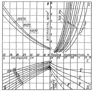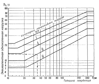 Примечания: 1. Расстояния между пневматиками условной четырехколесной опоры принят равными между сметными колесами 70 см и рядами колес 130 см. 2. Нормативны нагрузки III и VI категорий допускается устанавливать одноколесными, равными соответственно 17 и 12 тс, а давление в пневматиках для V и VI категорий нагрузки - равным 8 кгс/см2.