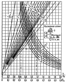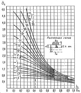 формуле (41) вычисляется вычисляются отношения H/Дэ и Ео/Еср.осн, где Еср.осн - средний модуль упругости слоев оснований между рассматриваемым монолитным слоем и грунтовым основанием, определяется по формуле (40); по номограмме на рис. 18 определяется эквивалентный модуль упругости многослойного основания под рассчитываемым слоем Eэ.осн; затем