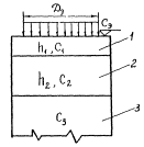 где h1, h2 - толщины соответственно первого и второго слоев основания; Сэ - эквивалентный коэффициент постели всех слоев основания; С1, С2, С3 - значения коэффициентов постели материалов первого, второго и третьего слоев основания; Ду - условный диаметр круга передачи нагрузки от покрытия на основание, принимаемый по таблице. В основаниях из двух слоев принимают h2 = 0 и K2 = 0. Для необработанных материалов и грунтов C = 0,01Е. (4) Для материалов, обработанных органическими вяжущими C = 0,005Е, (5) где Е - расчетные значения модулей упругости материалов слоев, принимаемые по табл. 6, 15-18. Основания жестких покрытий Расчетная схема слоистого основания для определения эквивалентного коэффициента постели: 1 - искусственное основание из материалов, обработанных органическими вяжущими, или из необработанных материалов; 2 - дренирующий или тепло- морозо-защитный слой, различные насыпи, слои замены грунта; 3 - естественное грунтовое основание
