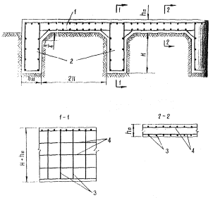 где Eн и Ев - модули упругости соответственно нижнего и верхнего слоев укрепленного основания. Для слоев из материалов, не обработанных вяжущими, определяется эквивалентный коэффициент постели системы, состоящей из необработанного основания и грунта по формуле (1) приложения 3. При этом условный диаметр передачи нагрузки определяется по формуле (2) настоящего приложения. Рис. 2. Номограмма для определения отношения условного диаметра площади передачи нагрузки на основании Ду и толщин искусственных оснований hосн из материалов, обработанных вяжущими, под железобетонные монолитные и сборные покрытия Приложение 5КОНСТРУКЦИЯ И РАСЧЕТ АНКЕРААнкер представляет собой монолитную железобетонную конструкцию, состоящую из анкерной плиты и шпор, заглубленных в грунт. Схема анкера представлена на рис. 1. Рис. 1. Схема анкера: 1 -плита; 2 - анкерная шпора; 3 - рабочая арматура; 4 - конструктивная арматура Толщину анкерной плиты hп и ширину шпор bш рекомендуется принимать постоянными и равными соответственно 30 и 100 см. Число шпор и глубина их заложения Н определяется путем расчета из условия равновесия анкера под действием сил натяжения арматуры N(тс/пог.м) и сил сопротивления анкера сдвигу Fсдп N ≤ Fсдп. (1) Сопротивление анкера сдвигу определяется по формуле Fсдп = n·Fсд, (2) где n - число шпор; Fсд - сопротивление сдвигу одной шпоры и прилегающих к ней частей анкерной плиты, определяется по графику на рис. 2 настоящего приложения. Глубина заложения шпор должна быть в пределах 1,5-2,5 м. Расстояние между шпорами в свету принимается равным 2Н. Армирование анкера выполняется сталью класса А-II. Потребное количество рабочей арматуры принимается по таблице. Таблица
