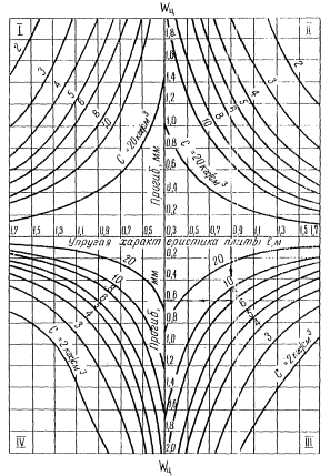 Еосн - модуль упругости укрепленного основания принимаемый по табл. 14-16; С и ℓ - значения соответственно расчетного коэффициента постели грунтового основания и упругой характеристики плиты, лежащей на грунте; Стр - значение требуемого коэффициента постели основания, при котором соблюдается условие прочности (l)