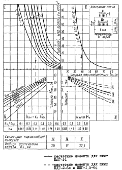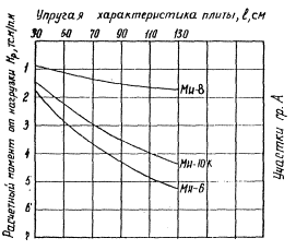 Рис. 4. Расчетная схема параметров загружения опор воздушного судна K - переходный коэффициент, принимается равным 1,2 для бетонных и армобетонных покрытий, а также монолитных железобетонных предварительно-напряженных покрытий с двухосным обжатием при определении расчетного момента в продольном направлении для расчета поперечных сечений плиты; для монолитных и сборных железобетонных предварительно напряженных покрытий с одноосным обжатием бетона, а также с двухосным обжатием бетона, при определении расчетного момента в поперечном направлении для продольного сечения плиты K = 1; для железобетонных покрытий с ненапрягаемой арматурой K принимается по рис. 5 и 6; Рис. 5. Значения переходных коэффициентов K для изгибающих моментов: а - положительных; б - отрицательных Рис. 6. Зависимость поправочного коэффициента K, от упругой характеристики плиты KN - коэффициент, учитывающий увеличение изгибающего момента в плите вследствие неравномерного накопления остаточных прогибов в основании и принимаемый по графику на рис. 7 в зависимости от приведенной интенсивности движения воздушных судов uo и вида грунта. Для оснований из материалов, обработанных вяжущими, коэффициент KN следует принимать равным 1. При отсутствии данных об интенсивности движения коэффициент KN рекомендуется принимать по табл. 2 приложения 6; Рис. 7. Зависимость коэффициента KN от интенсивности движения расчетного воздушного судна: 1 - глины, суглинки и супеси пылеватые; 2 - пески и супеси непылеватые Kx(y) - коэффициент, учитывающий перераспределение внутренних усилий в ортотропных плитах (принимается для покрытий с различной жесткостью Bx и Вy в продольном и поперечном направлениях по графику рис. 8. Для типовых аэродромных плит заводского изготовления Kx(y) следует принимать по табл. 1 приложения 4. Для бетонных, армобетонных, железобетонных с ненапрягаемой арматурой и предварительно напряженных покрытий с одинаковом двухосным обжатием бетона Kx(y) = 1; Рис. 8. График для определения коэффициентов Kx и Ky М1 - изгибающий момент от действия колеса, центр отпечатка которого совпадает с расчетным сечением (см. рис. 4); nk - число колес на опоре;