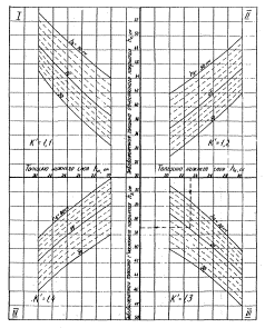 Приложение 2МЕТОДИКАОПРЕДЕЛЕНИЯ ОДНОКОЛЕСНОЙ ЭКВИВАЛЕНТНОЙ НАГРУЗКИ ДЛЯ НЕЖЕСТКИХ ПОКРЫТИЙОдноколесной эквивалентной нагрузкой является нагрузка, вызывающая в покрытии, несущем слое и грунтовом основании те же критические напряжения, что и многоколесная опора при одном и том же давлении в пневматиках. Для каждого конструктивного слоя определяется соответствующая эквивалентная одноколесная нагрузка с учетом толщины вышележащих слоев Н. При расчете конструкции по относительному упругому прогибу и сдвигу в грунте расчетная толщина Н принимается равной сумме слоев, лежащих над грунтовым основанием. Для слоев, сопротивляющихся изгибу, расчетная толщина H равна сумме, толщин вышележащих слоев и рассматриваемого слоя. В качестве исходных данных используются геометрические параметры главных опор в соответствии со схемами (см. рисунок). По известным значениям этих параметров и расчетной нагрузке на одно колесо Рк и опору Роп строится линейный график в двойных логарифмических координатах lgРэ и lgH. На графике откладываются две точки: А с координатами Н = d/2 и Рэ = Рк и В с координатами Н = 2Sd и Рэ = Pоп. Точки соединяются прямой линией. Величина расчетной эквивалентной нагрузки для рассматриваемого слоя определяется на графике по известной толщине Н. График определения эквивалентной одноколенной нагрузки для нежестких покрытий (1-5 расчетные схемы различных вариантов главных опор) Приложение 3МЕТОДИКАОПРЕДЕЛЕНИЯ ЭКВИВАЛЕНТНОГО КОЭФФИЦИЕНТА ПОСТЕЛИ И МОДУЛЯ УПРУГОСТИ ЕСТЕСТВЕННЫХ И ИСКУССТВЕННЫХ ОСНОВАНИЙ ИЗ МАТЕРИАЛОВ, ОБРАБОТАННЫХ ОРГАНИЧЕСКИМИ ВЯЖУЩИМИ, И ИЗ НЕОБРАБОТАННЫХ МАТЕРИАЛОВЭквивалентный коэффициент постели слоистого основания (см. рисунок) определяется по формулам