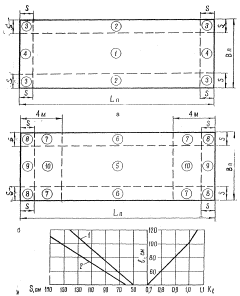 Примечания: 1. При использовании отдельных участков ИВПП, МС или перронов для систематического руления воздушных судов значения коэффициентов m для этих участков следует принимать как для участков группы А. 2. При расчете сборных покрытий из железобетонных предварительно напряженных плит коэффициент m следует увеличивать на 10 %. 3. Приведенные в таблице коэффициенты m даны для аэродромов, расположенных северней 50° северной широты; при расположении аэродрома южнее этой границы коэффициенты m следует устанавливать с учетом поправочных коэффициентов, принимаемых равными: для монолитных покрытий аэродромов, расположенных между 43 и 50° северной широты - 0,95; для расположенных южнее 43° северной широты - 0,9; для сборных покрытий во всех случаях - 1. Расчетные схемы усилий и эпюры напряжений в сечениях плит различных типов покрытий приведены на рис. 10. При вариантном проектировании жестких покрытий под категории нормативных нагрузок рекомендуется пользоваться номограммами, приведенными на рис. 4-16 и 21-26 приложения 6. 3.54 (5.56). Расчетное число приложений нагрузки на покрытие и грунтовое основание Uo следует определять по формулам